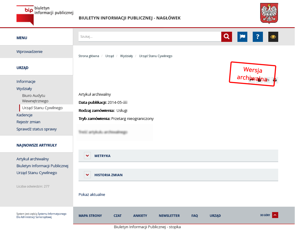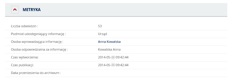 Metryka – rozwinięcie pola spowoduje wyświetlenie dodatkowych danych odnoszących się do wyświetlanego artykułu.