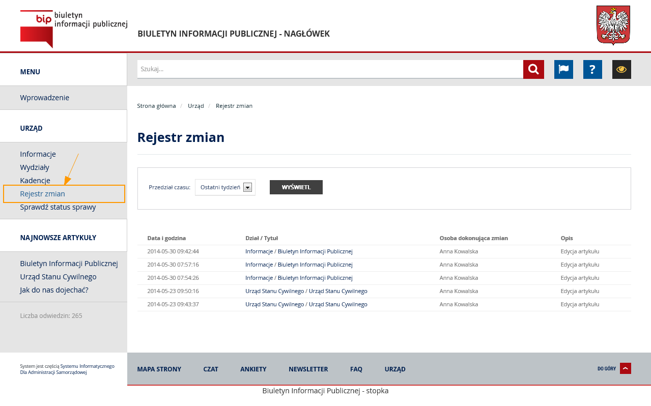 W Menu głównym, użytkownik może dodatkowo odnaleźć katalog Rejestr zmian, który wyświetlany jest w każdym menu podmiotowym aplikacji. W Rejestrze zmian znajdują się informacje na temat zmian i modyfikacji artykułów. Za pomocą wbudowanych filtrów użytkownik może zdefiniować przedział czasu, z którego mają zostać wyświetlone informacje.