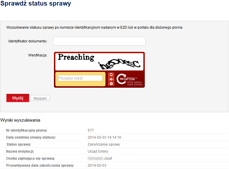w menu głównym użyć przycisku Sprawdź status sprawy. Następnie w polu Identyfikator pisma, należy wprowadzić numer identyfikacyjny dokumentu, który został mu nadany podczas jego rejestracji. W polu Weryfikacja przepisać wyświetlany w okienku tekst i użyć przycisku Wyślij. System wyświetli informację zwrotną pod oknem wyszukiwarki.
