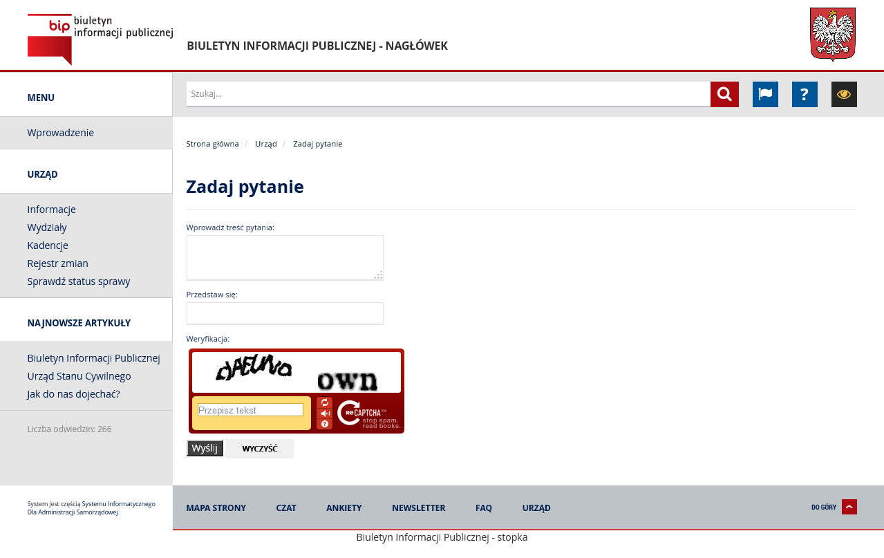 FAQ – odnośnik dostępny dla użytkowników strony podmiotowej BIP. Kliknięcie w link powoduje wyświetlenie formularza, który umożliwia kierowanie pytań bezpośrednio do osób odpowiedzialnych za treści zawarte na danym portalu. Internauta, który chce wysłać pytanie musi uzupełnić wyświetlone pola. W polu Weryfikacja, należy przepisać oba wyrazy znajdujące się na obrazku i kliknąć przycisk Wyślij.