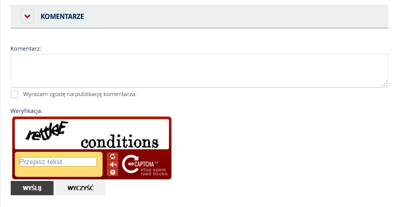 Komentarze – rozwinięcie pola umożliwia skomentowanie artykułu. Internauta, który chce wysłać komentarz musi uzupełnić wyświetlone pola. W polu Weryfikacja, należy przepisać oba wyrazy znajdujące się na obrazku, zaznaczyć pole zgody, kliknąć przycisk Wyślij.