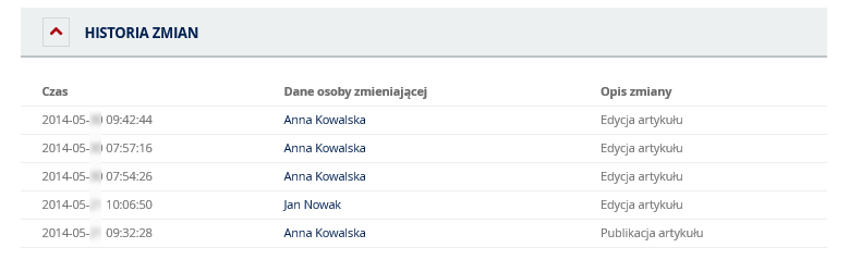 Historia zmian – rozwinięcie pola spowoduje wyświetlenie listy, imienia i nazwiska osoby odpowiedzialnej oraz czas wykonania zmian prezentowanego artykułu.