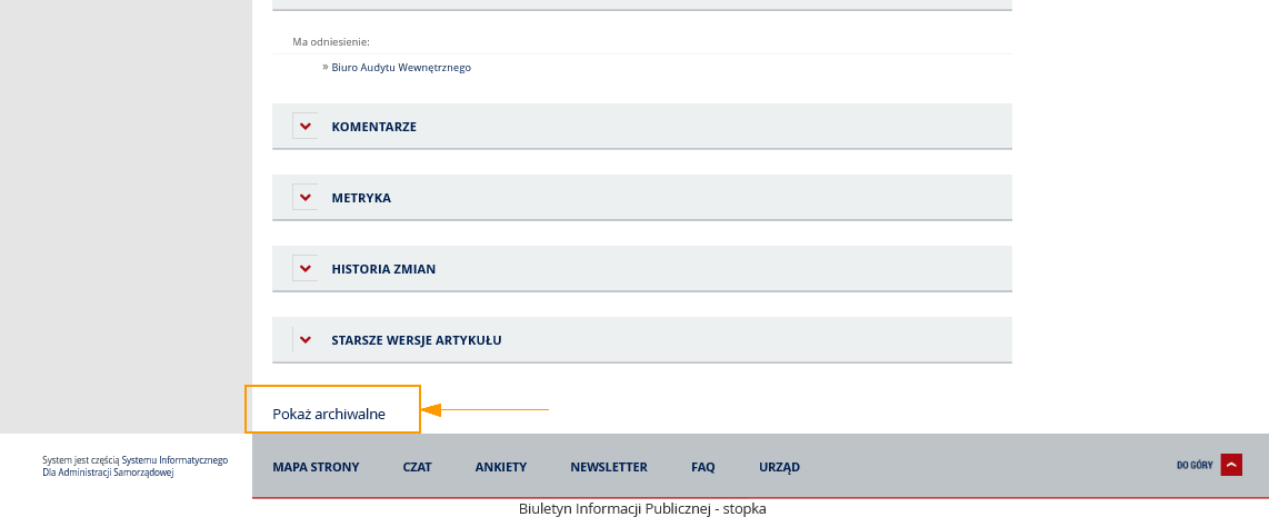 Dodatkowo pod danym artykułem użytkownik, może odnaleźć odnośnik Pokaż archiwalne, którego użycie spowoduje wyświetlenie archiwalnych wersji artykułów.